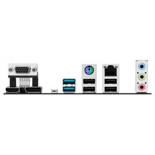 - Puertos traseros: 2 USB 10 Gbps, 4 USB 2.0, 1 DisplayPort, 1 HDMI, 1 VGA, 1 Ethernet, 3 jacks de audio, 1 PS/2 combo, 1 botón BIOS FlashBack
