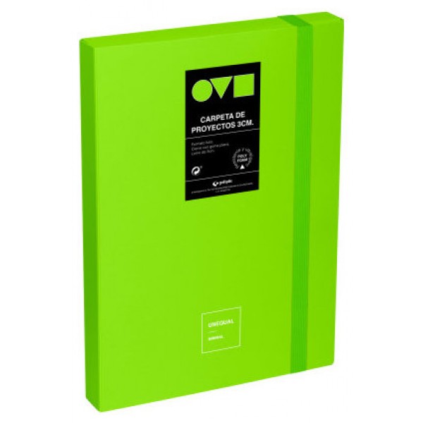 Caja proyectos Unequal Minimal color verde. Esta caja de proyectos tiene unas cubiertas realizadas en polyfoam, material resistente y ultraligero, tamaño folio, apertura 360º, cierre con goma plana y lomo de 30 mm.