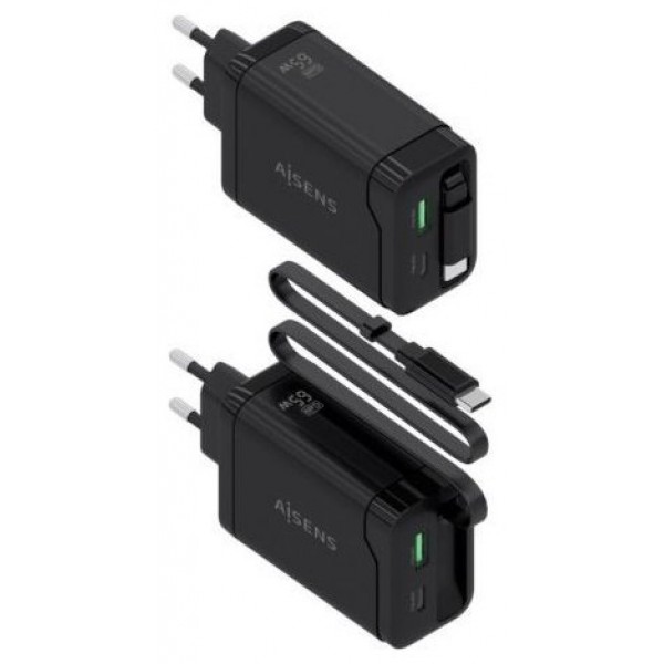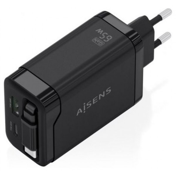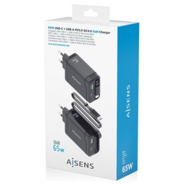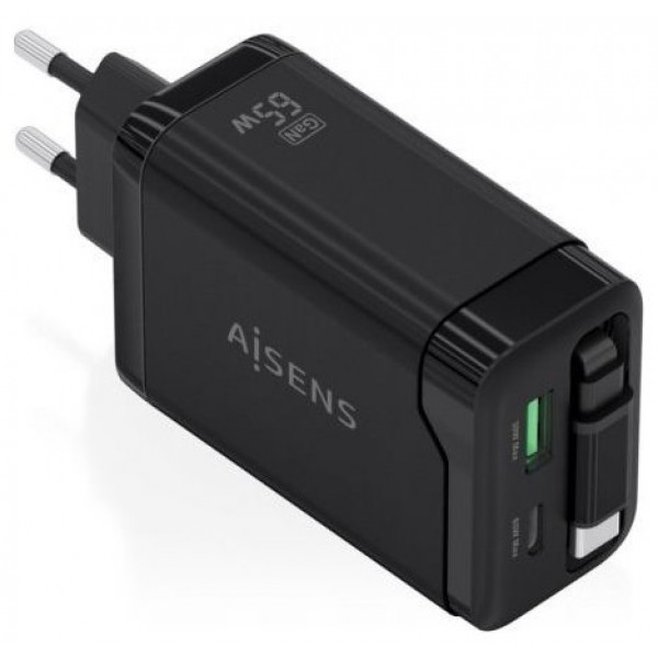 ASCH-65W3P071-BK – Cargador GaN 65W, 1xUSB-C Cable Retráctil, 1xUSB-C PD3.0, 1xUSB-A QC3.0, Negro