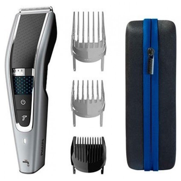 Consigue un corte de pelo uniforme gracias a la tecnologÃa DualCut y Trim-n-Flow Pro. El nuevo diseño del peine-guÃa evita que el pelo de cualquier longitud se atasque, para que puedas terminar el peinado de una pasada. El innovador diseño del peine-guÃa permite que el cabello cortado quede alejado de las cuchillas mientras se está usando, lo que evita que incluso los cabellos de mayor longitud se atasquen en el peine-guÃa. Asà podrás comenzar y terminar tu peinado sin interrupciones. Gira la rueda de ajuste de longitud de corte y bloquee la longitud que deseas. Los dos peines-guÃa ajustables cortan entre 3 mm y 28 mm, con una precisión de 1 mm entre cada longitud. Utiliza el peine-guÃa para la barba de 2 mm para cortar pelos cortos o para perfilar tu barba. Retira el peine-guÃa para un corte apurado de 0,5 mm. El cortapelos es resistente al agua, para una fácil limpieza sin complicaciones debajo del grifo. Enjuaga bien solo con agua para que el cortapelos siga funcionando como el primer dÃa. El cortapelos Series 5000 ha sido diseñado con facilidad de uso, comodidad de manejo y sencillez de funcionamiento. La textura especial y el mango permiten mover fácilmente el cortapelos y recortar por toda la cabeza. Mantén el cortapelos, los peines-guÃa y los accesorios organizados en el estuche resistente.