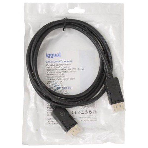 | Características | - Cable DisplayPort de alta velocidad - Entrada / Salida: DisplayPort macho - Resoluciones compatibles*: 720p / 1080i / 1080p / 2K / 4K - Ancho de banda: hasta 21,6 Gbps - Parámetro: 30 AWG - Conectores dorados - Materiales: PVC + cobre + acero - Longitud: 180 cm - Color: negro * 4K(2160p)@60Hz / 2K(1080p)@120Hz / FQHD(1080p)@120Hz |