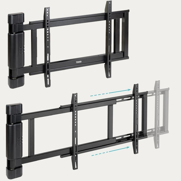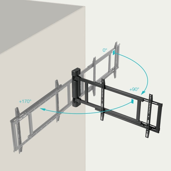 Soporte de pared eléctrico para pantallas de 32” a 75”, con regulación motorizada mediante mando a distancia y memoria para dos posiciones. Ofrece ajuste horizontal de hasta 1220 mm, giro de 0° a +170° y diseño ultrafino a solo 56 mm de la pared.
