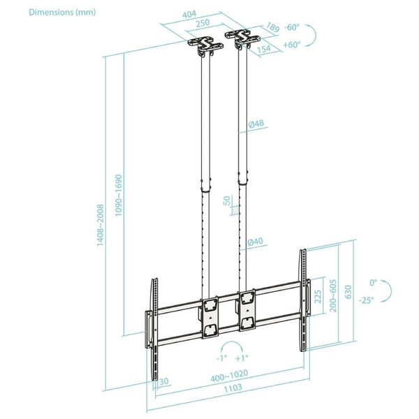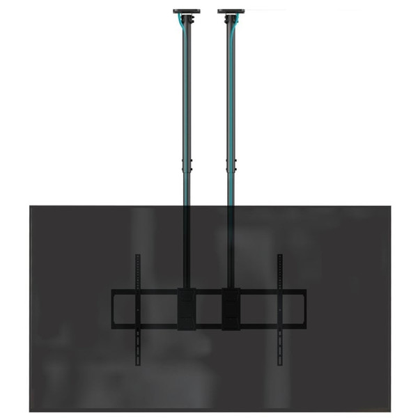 Soporte de techo extensible con doble mástil para pantallas de 60” a 120”, con capacidad de carga de hasta 120 kg. Permite inclinación de 0° a -25° y nivelación de ±1° para un ajuste óptimo del ángulo de visión. Distancia al techo regulable entre 1090 y 1690 mm, apto para techos inclinados (±60°), con sistema de gestión de cables y compatible con pantallas curvas.