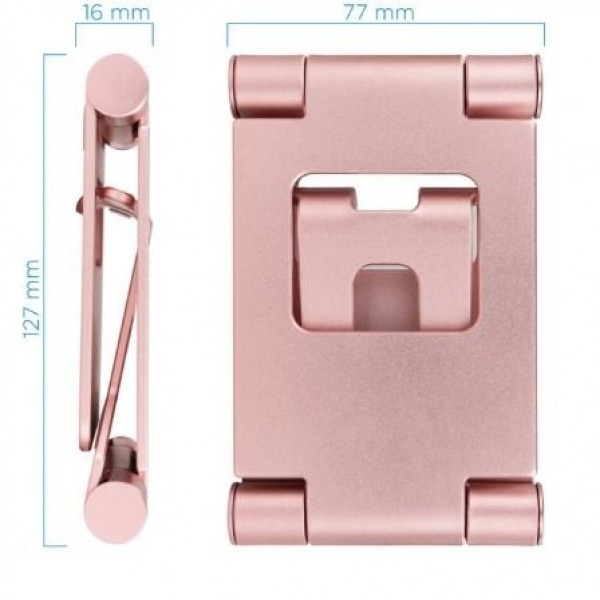 | Características | - Soporte de mesa ajustable y giratorio para teléfono / tablet de hasta 10” - Material: Fabricado en aleación de aluminio - Dispone de almohadillas de silicona antideslizantes, para proteger de arañazos y deslizamientos. - Plegado compacto del soporte para facilitar su guardado y transporte. - Medidas del producto plegado: 77 x 127 x 16 mm - Color: Rosa - Peso: 0,218 kg |