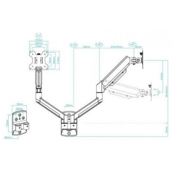 - Peso soportado de pantalla: Mínimo 2 kg, Máximo 10 kg por cada brazo
