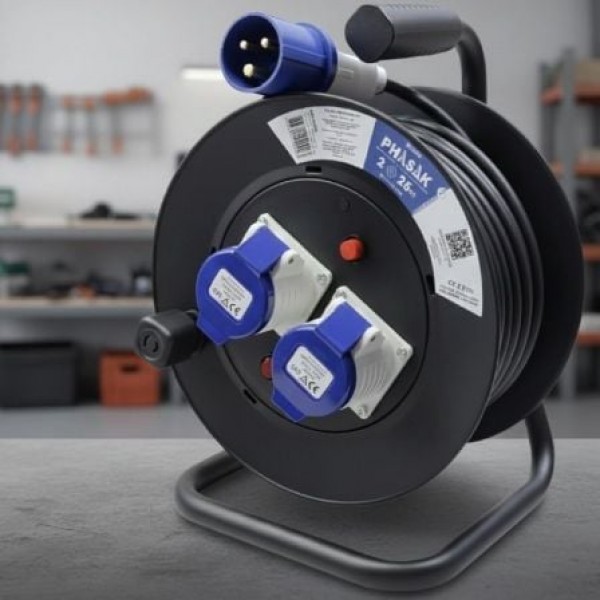 Regleta enrollable PHASAK 2× enchufe industrial 2P+TT con protección – 25 m (BN 3475)
