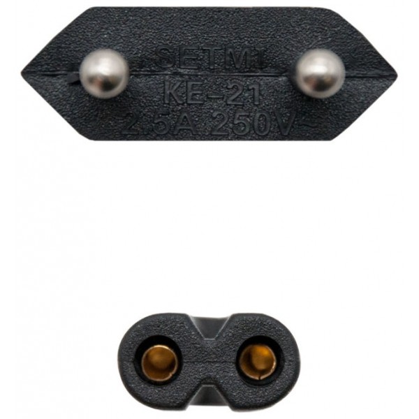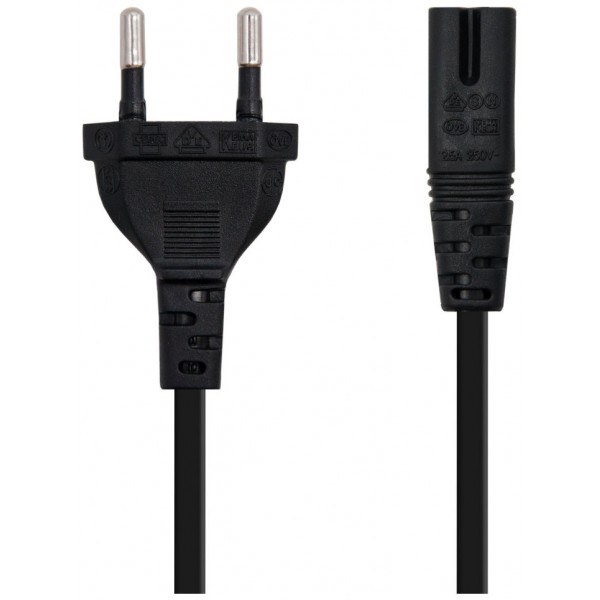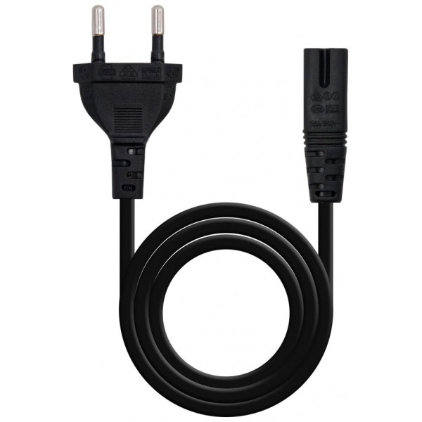Cable de alimentación con forma 8 para cargar portátiles, equipos audiovisuales, consolas, y otros dispositivos electrónicos de baja potencia (consumo inferior a 1500W). Fabricado con conductor 100% cobre de AWG18.