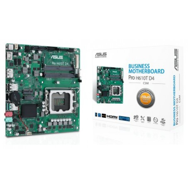 ASUS Pro H610T D4-CSM. Fabricante de procesador: Intel, Socket de procesador: LGA 1700, Procesador compatible: Intel® Celeron®, Intel® Core™ i3, Intel® Core™ i5, Intel® Core™ i7, Intel® Core™ i9, Intel® Pentium®. tipos de memoria compatibles: DDR4-SDRAM, Memoria interna máxima: 64 GB, Tipo de ranuras de memoria: SO-DIMM. Interfaces de disco de almacenamiento soportados: M.2, SATA III, Tipos de unidades de almacenamiento admitidas: HDD & SSD. Tipo de interfaz ethernet: Gigabit Ethernet. Componente para: PC, Factor de forma: mini ITX, Familia del chipset: Intel