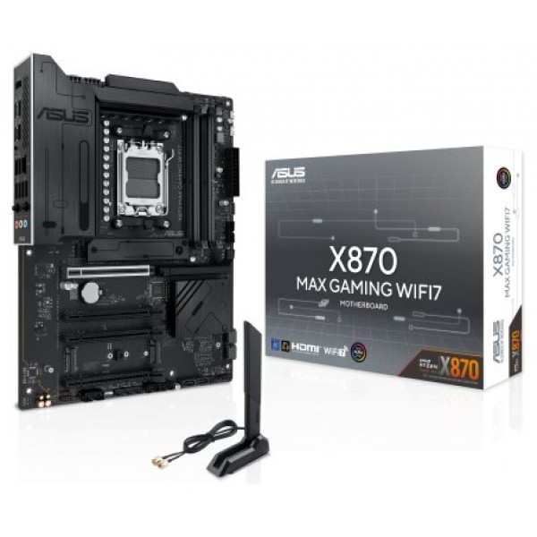 ASUS X870 MAX GAMING WIFI7. Fabricante de procesador: AMD, Socket de procesador: Zócalo AM5, Procesador compatible: AMD Ryzen 7000 Series, AMD Ryzen 8000 Series, AMD Ryzen 9000 Series. tipos de memoria compatibles: DDR5-SDRAM, Memoria interna máxima: 256 GB, Tipo de ranuras de memoria: DIMM. Interfaces de disco de almacenamiento soportados: M.2, SATA III, Tipos de unidades de almacenamiento admitidas: HDD & SSD, Niveles RAID: 0, 1, 5, 10. Conector USB: USB tipo A, USB Tipo C. Tipo de interfaz ethernet: 2.5 Gigabit Ethernet, Estándar Wi-Fi: Wi-Fi 7 (802.11be)