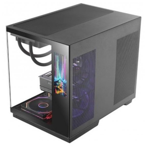 Su estructura de doble cámara optimizada separa la fuente de alimentación y el almacenamiento del resto de componentes. Esta organización mejora el flujo de aire, facilita el montaje y mantiene los cables ocultos, garantizando una estética impecable y un rendimiento térmico superior.