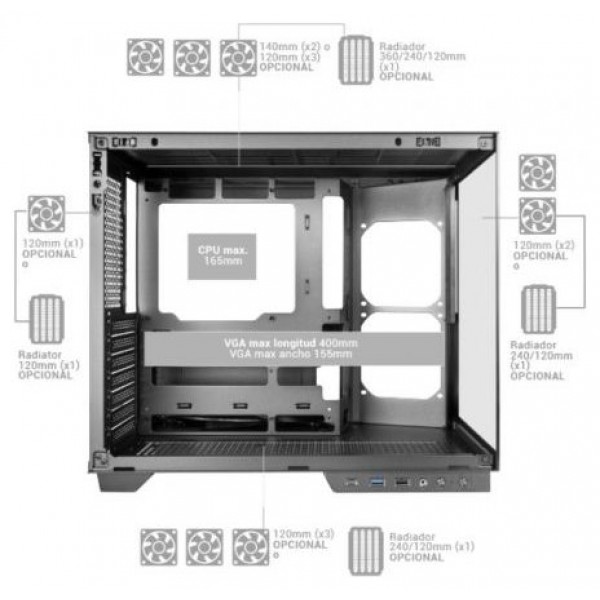 - Soporte refrigeración líquida: 360mm, 240mm, 120mm superior / 240mm, 120mm inferior / 240mm, 120mm interior / 120mm trasero