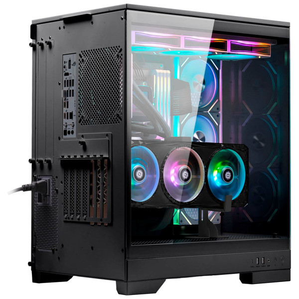 Admite placas E-ATX, gráficas de 470 mm, coolers de 180 mm y hasta 10 ventiladores, refrigeraciones líquidas de 360 mm. Incluye cable Riser y un soporte para montar la GPU en vertical.