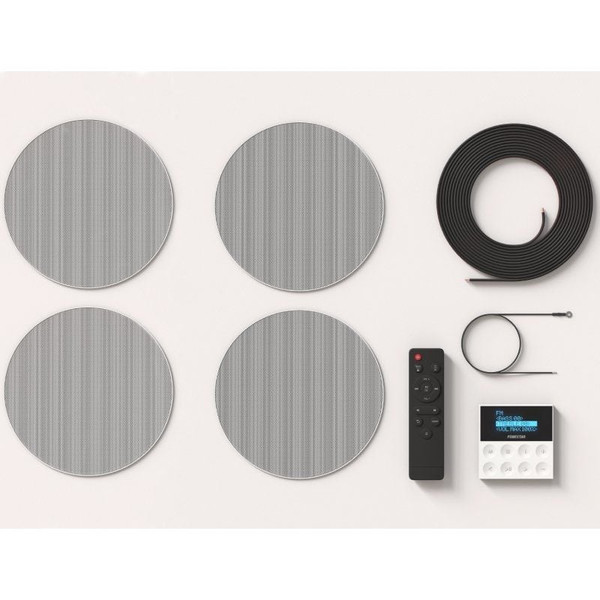 Kit de sonido (todo en uno) que incluye 4 altavoces de techo y amplificador de pared.