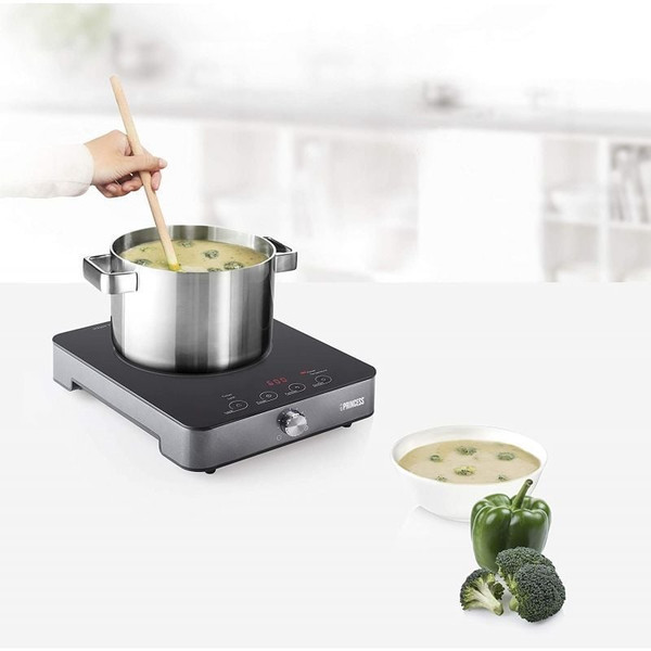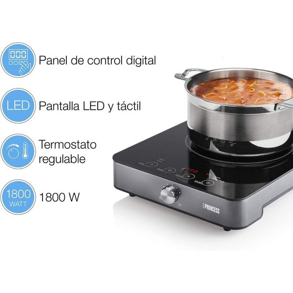 Para garantizar un uso seguro de la placa calefactora, la placa de inducción Princess cuenta con medidas de seguridad adicionales. La placa calefactora, que se apagará automáticamente si quita la sartén, cuenta además con protección contra sobrecalentamiento. La robusta base antideslizante garantiza que la placa calefactora no se mueva con facilidad. Además, la placa está fabricada con cristal de seguridad. La potencia total de la placa calefactora es de 1800 W, por lo que podrá conectarla en todas las tomas de corriente.Razones para escoger la placa calefactora de inducción Princess: