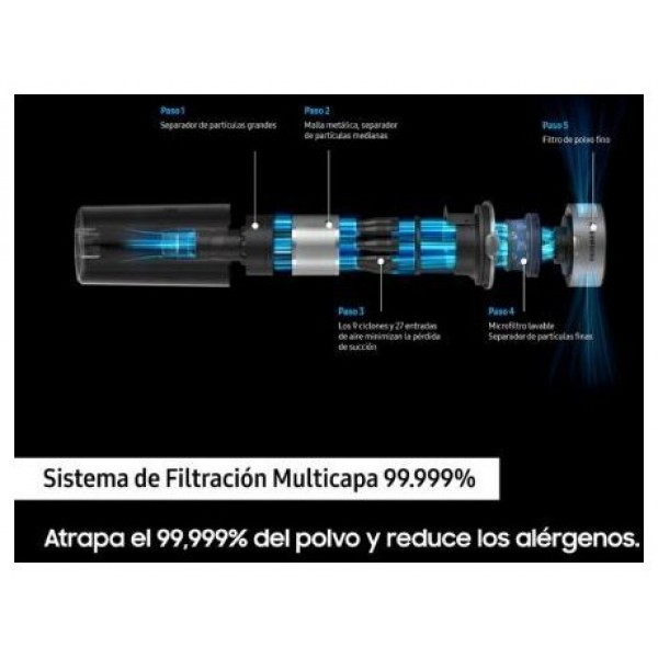 Disfruta de un aire más limpio y una potencia de succión extrema durante más tiempo con la estructura multiciclónica de alta eficiencia del sistema Jet Cyclone. Las 27 entradas de aire de Jet Cyclone crean una ruta de aire óptima, minimizando así la pérdida de succión. También separa higiénicamente las partículas finas de polvo del aire.