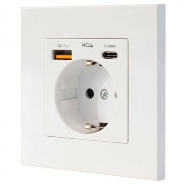 Base de enchufe de pared tipo schuko con 2 tomas USB: USB-A con QC 3.0 y otro USB-C con PD, 20W