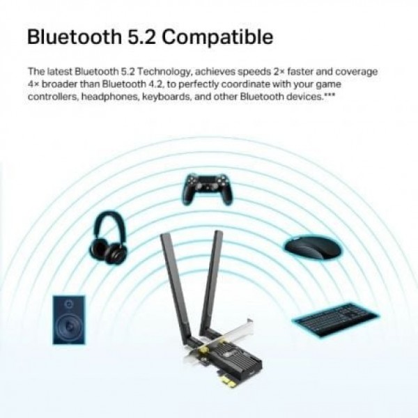 TP-LINK AX1800 DUAL BAND WI-FI 6 BLUETOOTH 5.2 PCI EXPRESS ADAPTER SPEED: 1201 MBPS AT 5 GHZ + 574 MBPS AT 2.4 GHZ SPEC: 2× HIGH GAIN EXTERNAL ANTENNAS FEATURE: MU-MIMO, OFDMA, WPA3, BLUETOOTH 5.2
