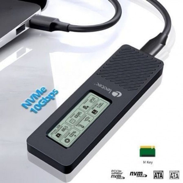 Transforma tu almacenamiento y lleva tus datos a un nivel superior con nuestra avanzada Caja de Disco Externo para SSD M.2 NVMe. Disenada para ofrecer la maxima velocidad y eficiencia, esta caja cuenta con una interfaz USB-C 3.2 que soporta velocidades de transferencia de hasta 10Gbps. Ideal para profesionales y entusiastas de la tecnologia que requieren un rendimiento sin compromisos y una gestion precisa de sus datos.. . Caracteristicas Principales:. . Compatible con discos SSD M.2 NVMe 2280: esta caja proporciona una integracion perfecta con tus dispositivos modernos, asegurando que tus datos siempre esten al alcance de la mano.. Velocidad de transferencia ultrarapida: Aprovecha la potencia del USB-C 3.2 para alcanzar velocidades de transferencia de hasta 10Gbps, permitiendote mover grandes volumenes de datos en cuestion de segundos.. Diseno elegante y compacto: Con un diseno elegante y compacto, esta caja de disco externo no solo es funcional sino tam- bien esteticamente agradable, perfecta para llevar contigo a cualquier lugar.. Material de alta calidad con disipacion de calor mejorada: Fabricada en aluminio de alta calidad con una superficie rayada, esta caja ofrece una excelente disipacion del calor, protegiendo tu SSD de posibles sobrecalentamientos y asegurando un rendimiento constante y fiable.. Facil Instalacion: Disfruta de una instalacion sin complicaciones gracias a su diseno intuitivo que te permite insertar tu SSD M.2NVMe de manera sencilla.. Pantalla LCD monocromo: Manten un control exhaustivo de tu disco con nuestra pantalla LCD integrada, que te proporciona informacion vital.. . INFORMACIóN PANEL LCD:. . Datos escritos en el disco: Monitoriza. la cantidad total de datos que has escrito en tu SSD, ayudandote a gestionar y planificar el uso de tu almacenamiento.. Salud del disco: Monitoriza la salud de tu SSD, permitiendote tomar medidas preventi- vas antes de que ocurran problemas.. Tiempo de trabajo: Consulta el tiempo total de operacion de tu SSD para evaluar su rendimiento y longevidad.. Temperatura del disco: Vigila la tempe- ratura de funcionamiento para evitar sobreca- lentamientos y asegurar un rendimiento optimo.. Numero de encendidos: Lleva un regis- tro de las veces que tu SSD se ha encendido, ayudandote a comprender mejor su uso y posi- bles patrones de desgaste.. Voltaje de trabajo: Monitorea el voltaje al que esta operando tu SSD para garantizar una alimentacion estable y segura.. . Especificaciones:. . Material: Aleación de aluminio. Compatible con: 2280 M.2 NVMe SSD. Dimensiones: 106 x 34 x 12mm. Alimentación: USB-C 5V >; 1.0A. Capacidad soportada: 4TB. Compatible con: Windows/ HarmonyOS/ MacOS/ Linux/ Android