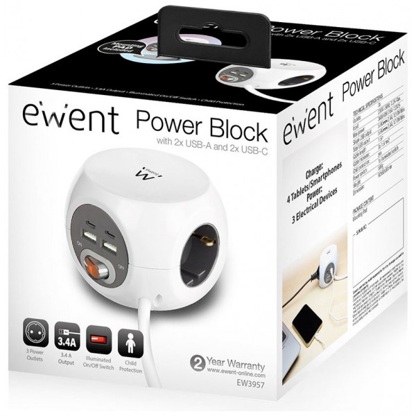 EWENT REGLETA 3 TOMAS SHUCKO + 2 PUERTOS USB-C + 2 PUERTOS USB (3.4 A / 17W)