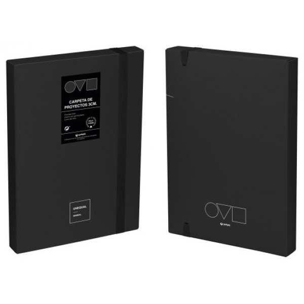 Caja proyectos Unequal Minimal color negro. Esta caja de proyectos tiene unas cubiertas realizadas en polyfoam, material resistente y ultraligero, tamaño folio, apertura 360º, cierre con goma plana y lomo de 30 mm.