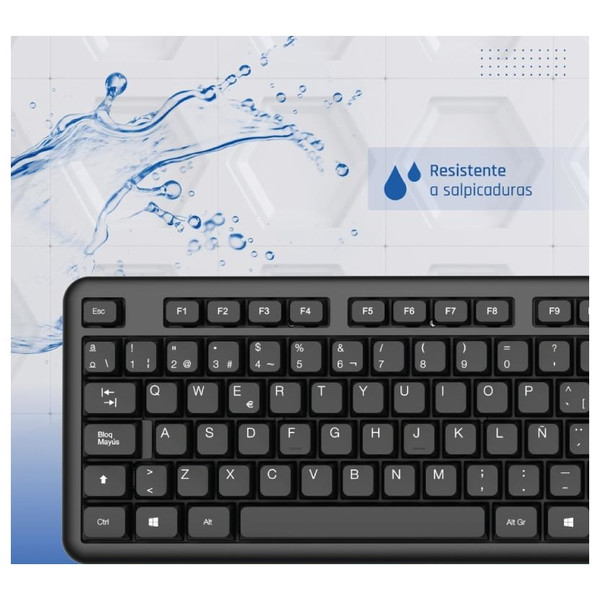 Incluye indicadores LED de bloqueo de mayúsculas, numérico y desplazamiento, así como una base antideslizante que garantiza estabilidad durante su uso. Además, su diseño es resistente a salpicaduras, ofreciendo mayor seguridad en entornos de oficina.