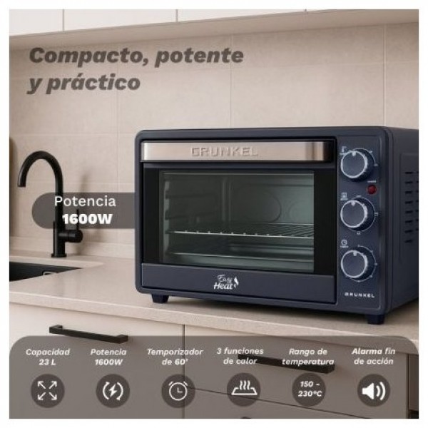 El horno eléctrico de GRUNKEL HR-23EASY es compacto y funcional, ideal para cocinas que buscan eficiencia y diseño en un solo electrodoméstico. Con 1600W de potencia y una capacidad de 23 litros, permite cocinar una amplia variedad de recetas como pizzas, carnes, pescados o postres. Ofrece 3 funciones de calor: superior, inferior o combinadas, que se adaptan a cada tipo de preparación. Su temperatura ajustable de 100 a 230 °C asegura resultados precisos, desde dorados intensos hasta cocciones suaves. El temporizador mecánico de hasta 60 minutos incluye aviso acústico, evitando que te preocupes por el tiempo. Gracias a su tirador de seguridad, se mantiene frío durante el uso, evitando quemaduras. Además, los detalles en acero inoxidable aportan durabilidad y estilo a cualquier cocina. El GRUNKEL HR-23EASY es una solución versátil, segura y potente para cocinar con libertad, control y resultados profesionales en casa.Especificaciones