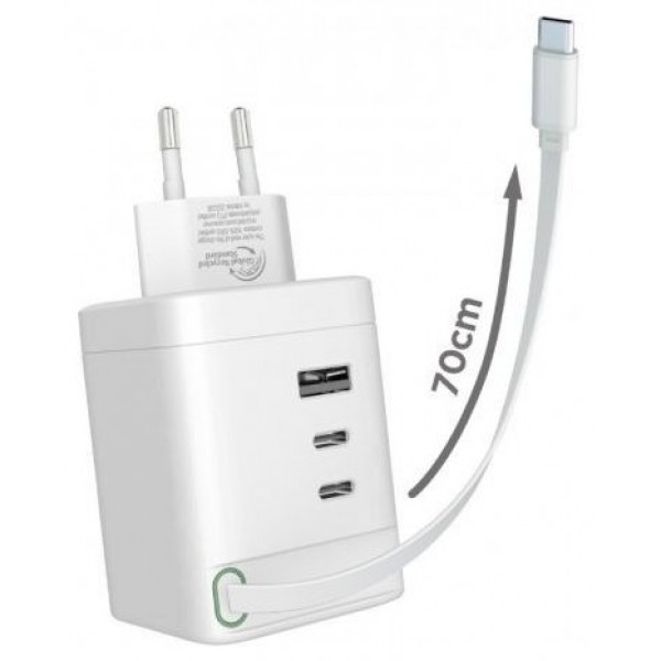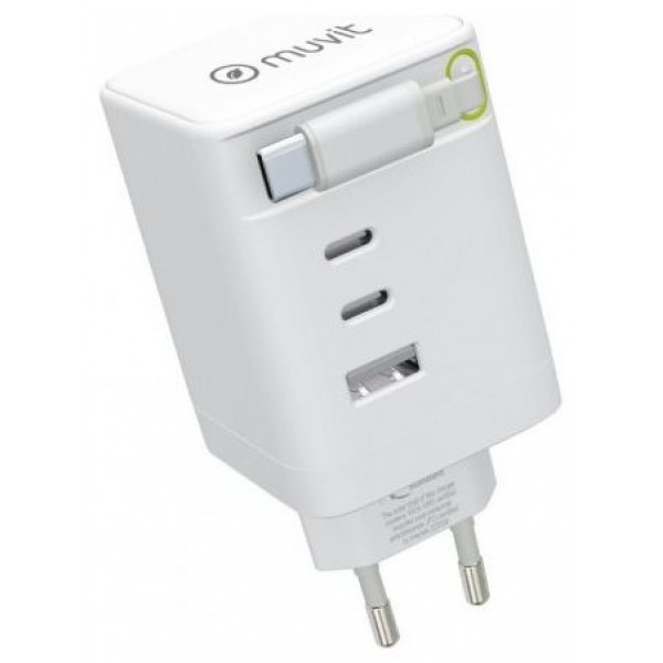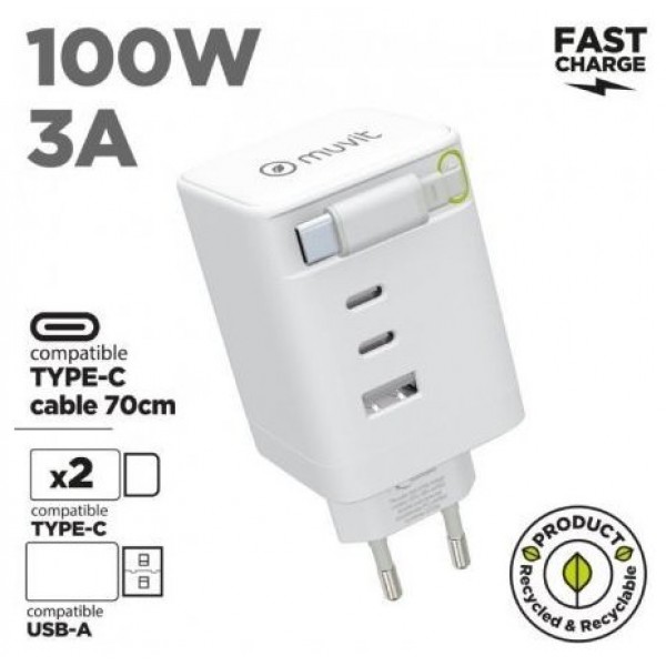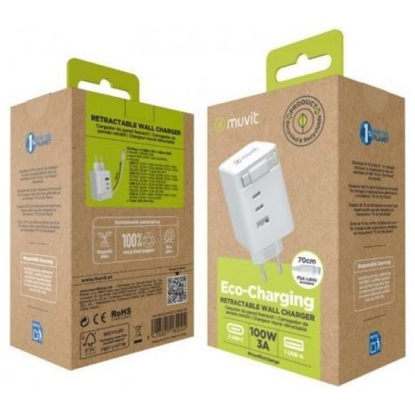 muvit for change cargador de pared Retráctil Tipo C PD 100W,2 USB-C y 1 USB blanco