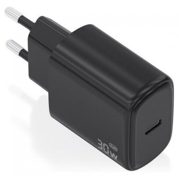 Cargador GaN USB-C de 30W diseñado para cargar portátiles, teléfonos móviles, cámaras y tablets, entre otros dispositivos. Presenta un diseño elegante, moderno y práctico.