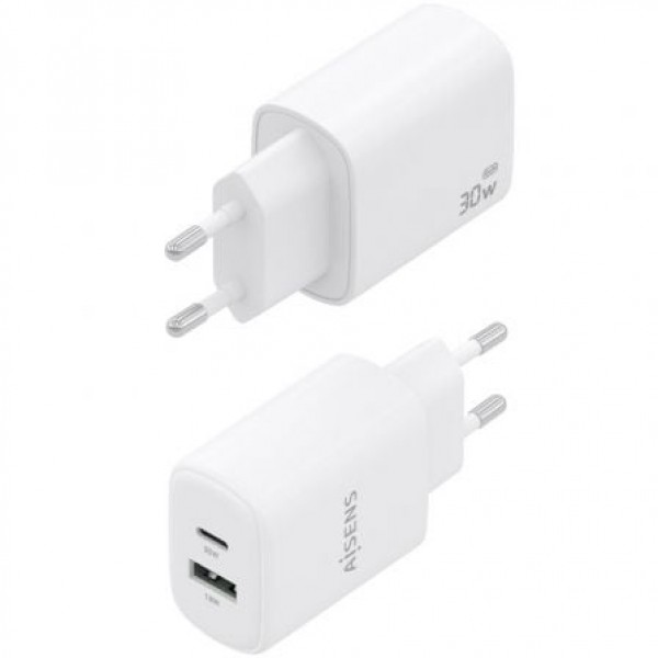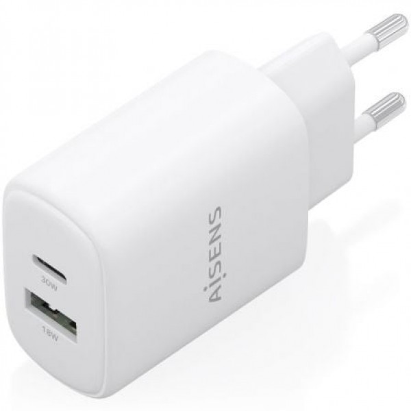 AISENS - CARGADOR GaN 30W, 1xUSB-C PD3.0 QC4.0, 1xUSB-A QC3.0, BLANCO