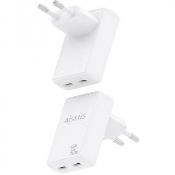 AISENS - CARGADOR DE PARED GaN ULTRA DELGADO 30W, 2xUSB-C PD3.0 QC4.0, BLANCO