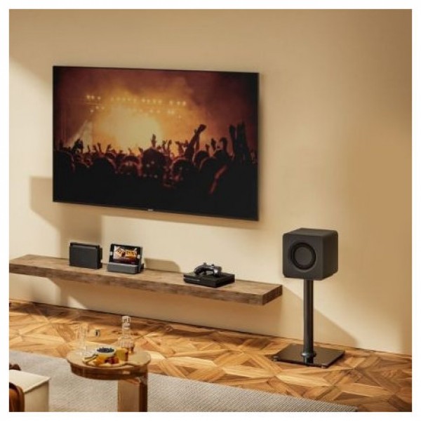 Fabricado con vidrio y acero de alta resistencia y pintado con pintura electrostática para un acabado perfecto. Optimiza el rendimiento de tus altavoces con este soporte de suelo versátil, diseñado para combinar estabilidad, durabilidad y estilo. Fabricado en acero de alta resistencia y vidrio, con un acabado en pintura electrostática, garantiza un soporte firme y un diseño moderno que se integra en cualquier espacio. Ideal para el salón, estudios o home cinema, este soporte mantiene tus altavoces a la altura óptima, asegurando un sonido limpio, claro y preciso.