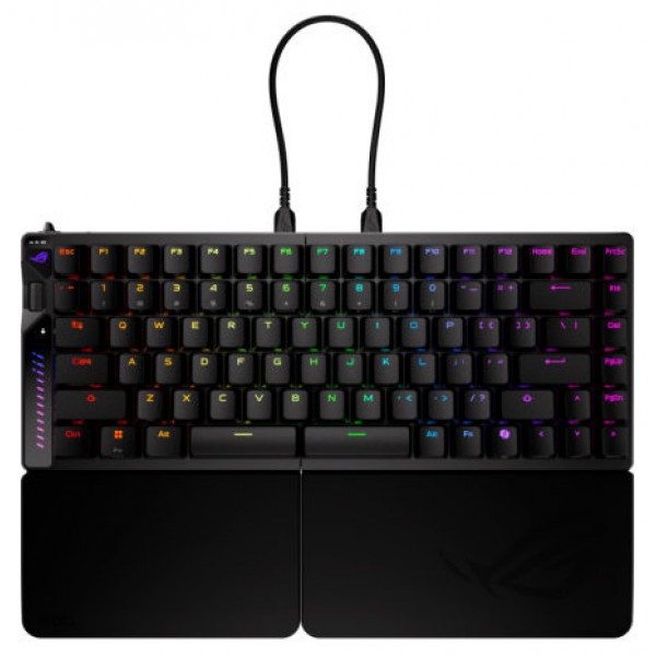 ASUS ROG Falcata. Formato del teclado: 75%. Estilo de teclado: Derecho. Tecnología de conectividad: Inalámbrico y alámbrico, Interfaz del dispositivo: USB + RF Wireless + Bluetooth, Interruptor del teclado: Magnetic-mechanical key switch. Tipo de retroiluminación: LED RGB, Descansa muñecas. Uso recomendado: Juego. Color del producto: Negro