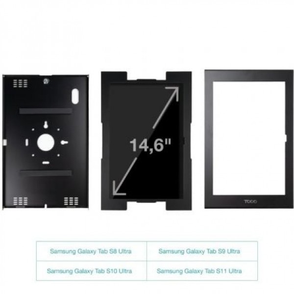 Marco antirrobo con cerradura a llave para tablets de 14,6”Tablets compatibles: Samsung Galaxy Tab S8 Ultra/ S9 Ultra/ S10 Ultra / S11 UltraCompatible con VESA 75x75Ranuras para un fácil acceso a todos los botones, cámara y cable de alimentación de la Tablet.Permite instalación directa en pared o montaje sobre soporte con VESA 75x75, como los modelos TQATC2601-B y TQATWM3401-B, entre otros.Almohadillas de protección para evitar arañazos y mejorar la sujeción.Incluye cerradura y llaves (2 uds.).Peso máximo soportado: 1 KgColor: NegroMaterial: fabricado en acero de alta calidadMedidas del producto: 250x392x22 mmPeso Neto: 1,660 Kg Peso bruto: 1,840 KgMedidas embalaje: 255x400x27 mm