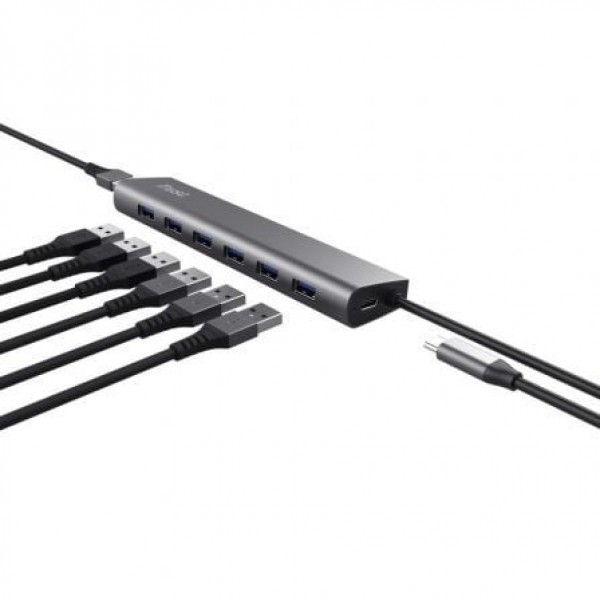 El séptimo cielo. Para el hub Halyx, siete es el número de la suerte: conecte hasta 7 dispositivos USB al PC o portátil, y aproveche el práctico puerto de alimentación USB-C cuando necesite un impulso adicional.. . ¡A toda máquina!. El hub USB Halyx evita pérdidas de tiempo: con altas velocidades de transferencia de hasta 5 Gbps con los puertos USB 3.2 Gen 1, le permite transferir archivos y otros elementos en un instante.. . Hace su trabajo. Con el hub Halyx, se trabaja sin estrés. Conectable a través de un solo cable USB de 80 cm, este hub fabricado en aluminio es superfácil de usar, lo que le permite concentrarse completamente en su trabajo. ¡Manos a la obra!. . Especificaciones:. . General. . Number of USB ports: 7. . Sustainability. . Plastic material: ABS / Aluminium. Recycled content %: 0 %. . Size & Weight. . Total weight: 108 g. Depth of main product (in mm): 33 mm. Width of main product (in mm): 156 mm. Height of main product (in mm): 16 mm. . Installation. . Driver needed: no. . Control. . Power switch: no. . Connectivity. . USB version: 3.2 gen 1. Storable cable: no. Cable length main cable: 80 cm. Ethernet port: no. . Input. . Power source: USB-C. . Output. . USB port A types: 7. USB port C types: 1. . Power adapter. . Power adapter included: no. . Compatibility. . Compatible Device Types: laptop, pc. Compatible Software Platforms: MacOS, Chrome OS, Windows