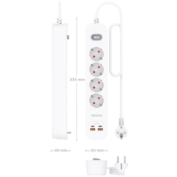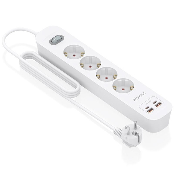 AISENS - REGLETA DE ENCHUFES MULTIFUNCION CON 4 TOMAS + CARGADOR PD3.0 20W 2xUSB-C, 2xUSB-A, 1.4M, BLANCO