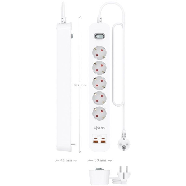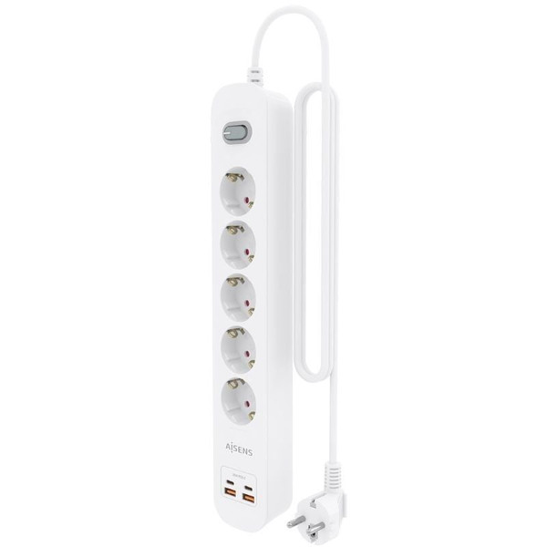 AISENS - REGLETA DE ENCHUFES MULTIFUNCION CON 5 TOMAS + CARGADOR PD3.0 20W 2xUSB-C, 2xUSB-A, 1.4M, BLANCO