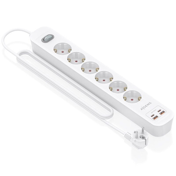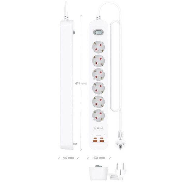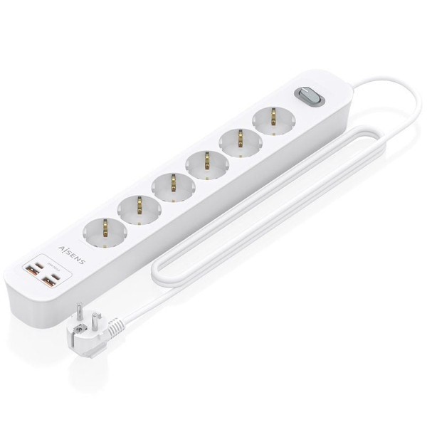 AISENS - REGLETA DE ENCHUFES MULTIFUNCION CON 6 TOMAS + CARGADOR PD3.0 20W 2xUSB-C, 2xUSB-A, 1.4M, BLANCO