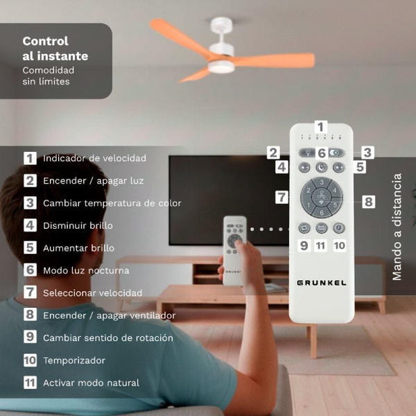 Ventilador de techo GRUNKEL SKYSTYLE52 de 52” con motor DC de 35W silencioso, 3 aspas efecto madera, 6 velocidades, rotación inversa, luz LED regulable 18W y mando a distancia.