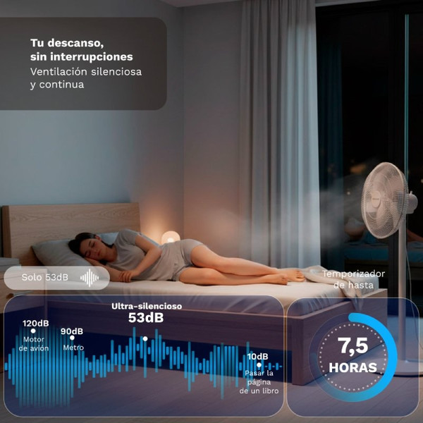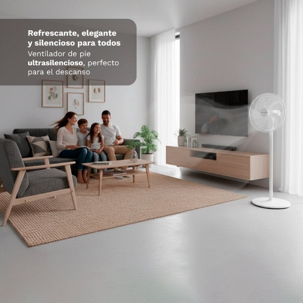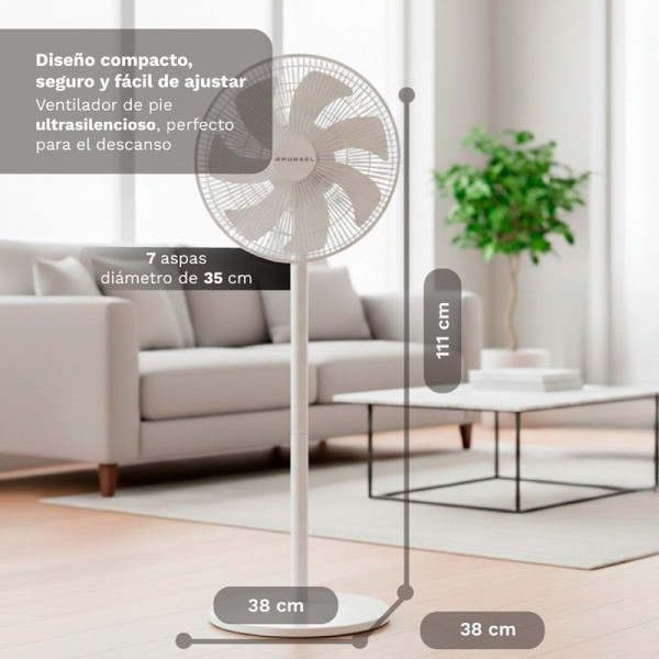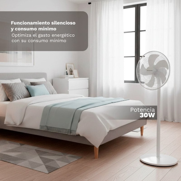 El ventilador de pie silencioso GRUNKEL FS-14PR está diseñado para ofrecer un alto nivel de confort con una ventilación potente y estable, ideal para dormitorios, salones o espacios de trabajo donde el silencio es importante. Gracias a su motor eficiente de 30W, proporciona un rendimiento óptimo con un consumo energético reducido. Incorpora 7 aspas de 35 cm (14 pulgadas) que generan un flujo de aire uniforme, constante y más potente, mejorando la sensación de frescor en toda la estancia. Su diseño optimizado permite disfrutar de una ventilación eficaz manteniendo un bajo nivel sonoro, perfecto para el descanso nocturno. Dispone de 12 niveles de velocidad, lo que permite ajustar con precisión la intensidad del aire según cada momento del día. Además, cuenta con 3 modos de funcionamiento: modo Normal para uso continuo, modo Natural que simula una brisa más suave y modo Sueño que reduce progresivamente la velocidad para favorecer el descanso. El ventilador incluye oscilación electrónica de 100°, que mejora la distribución del aire en toda la habitación, y una inclinación manual de 30°, permitiendo dirigir el flujo de aire de forma más precisa. También incorpora un temporizador programable de hasta 12 horas, que permite controlar el tiempo de uso y mejorar la eficiencia energética. Gracias a su mando a distancia, podrás controlar todas sus funciones cómodamente sin necesidad de desplazarte. Su base redonda de 36 cm aporta estabilidad y seguridad durante el uso, mientras que su diseño moderno en color blanco se integra fácilmente en cualquier estancia. Una opción eficiente, silenciosa y potente para disfrutar de un ambiente fresco con total comodidad.Especificaciones