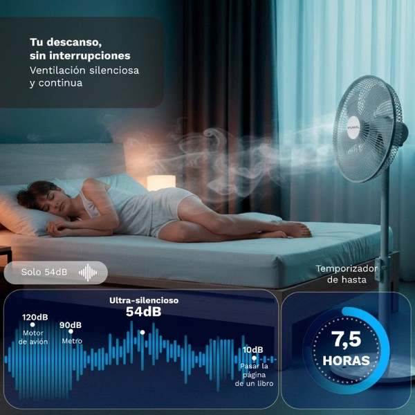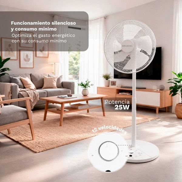El ventilador de pie GRUNKEL FS-14T está diseñado para ofrecer un alto nivel de confort con un funcionamiento ultrasilencioso, ideal para dormitorios, oficinas o cualquier espacio donde se busque frescor sin ruidos molestos. Gracias a su motor de 25W de bajo consumo, combina eficiencia energética con un rendimiento óptimo para el uso diario. Incorpora 7 aspas de 35 cm (14 pulgadas) que generan un flujo de aire más uniforme, constante y potente, mejorando la sensación de frescor en toda la estancia. Su diseño está optimizado para ofrecer una ventilación eficaz con un nivel sonoro reducido, perfecto para el descanso nocturno. Dispone de 12 niveles de velocidad, lo que permite ajustar con precisión la intensidad del aire según cada momento. Además, incluye 3 modos de funcionamiento: modo Normal para uso continuo, modo Natural que simula una brisa suave y modo Sueño que reduce progresivamente la velocidad para favorecer el descanso. El ventilador cuenta con oscilación electrónica de 100°, que distribuye el aire de forma uniforme, y una inclinación manual de 30°, permitiendo dirigir el flujo de aire hacia donde se necesite. Incluye temporizador programable de hasta 7,5 horas para controlar el tiempo de uso y optimizar el consumo energético. También dispone de mando a distancia, facilitando el control total del ventilador sin necesidad de moverse. Su diseño incorpora altura regulable de 91 a 110 cm y una base redonda de 36 cm, que proporciona estabilidad y un estilo moderno y funcional. Una solución potente, silenciosa y eficiente para disfrutar de un ambiente fresco y confortable en cualquier momento del día.Especificaciones
