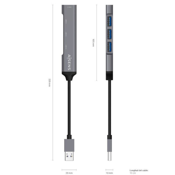 AISENS - HUB USB 3.0 ALUMINIO, TIPO A/M-4xTIPO A/H, GRIS, 10CM