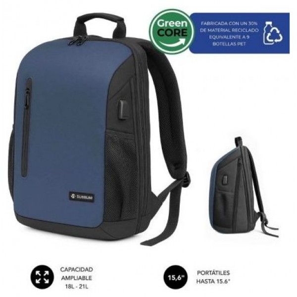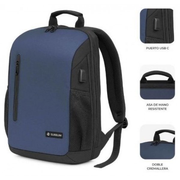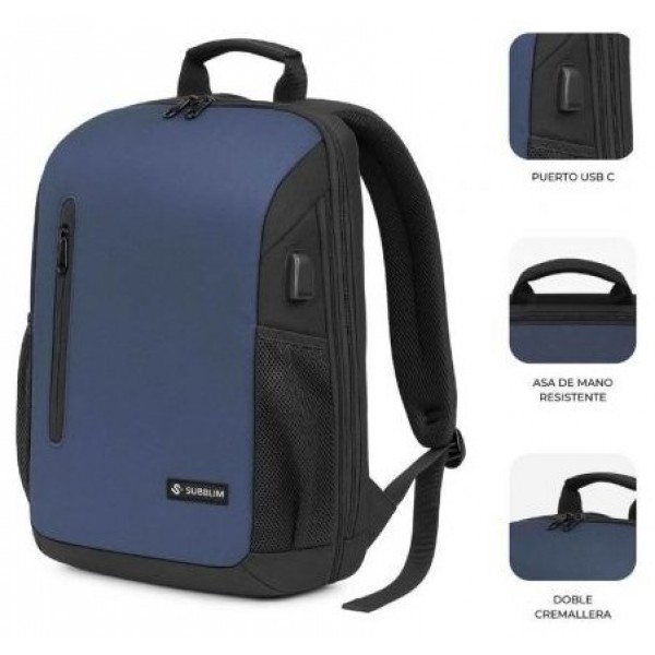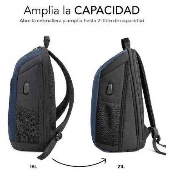 Bolsillo frontal de acceso rápido Panel interior para cargadores, bolígrafos y ratón Bolsillos laterales elásticos para botellas Puerto USB-C externo para cargar tu móvil en movimiento (requiere power bank)